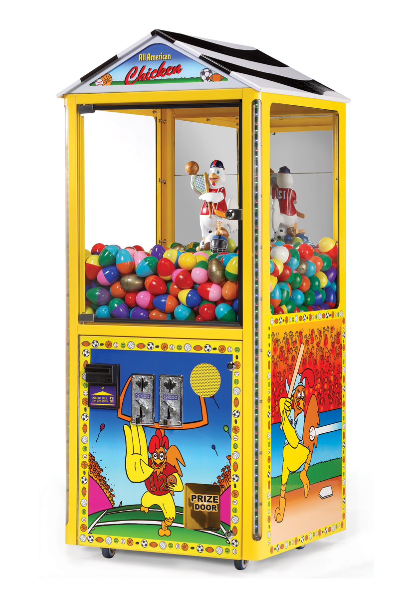 Children of all ages watch in amazement as All American Chicken spins around to one of five custom created music tracks and dispenses fun-filled toy.