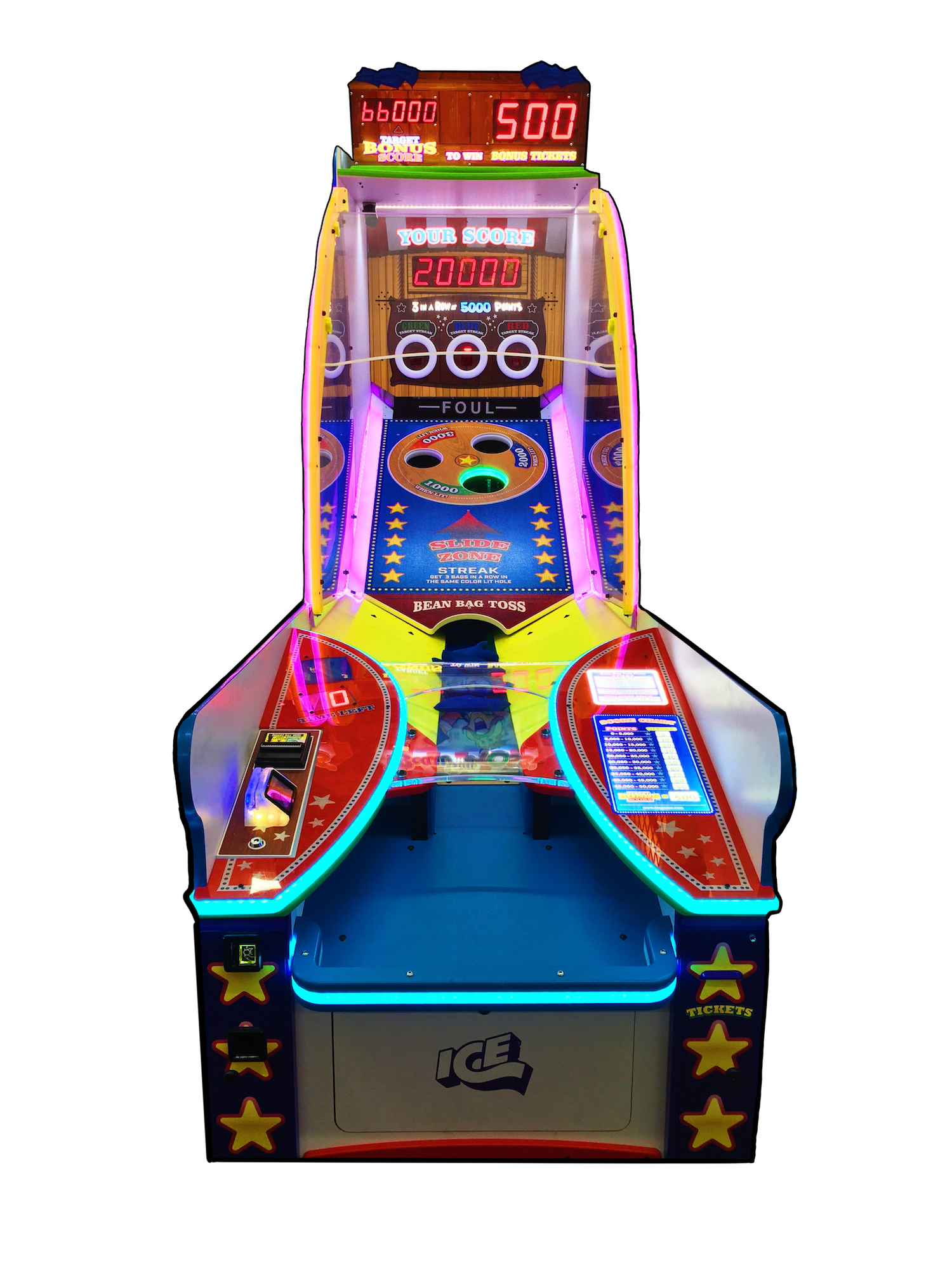 Bring the Midway of the amusement park directly to your arcade with this latest “carnival” game, BEAN BAG TOSS! Part of the Carnival Series, this long-awaited arcade machine is a fun and challenging spin on the classic bean bag toss everybody loves. Face the timer and see how many bean bags you can toss into the three moving targets, which move and light up!