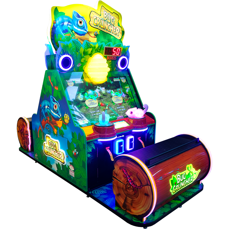Bug Cruncher is a video redemption game that is easy to play and holds strong appeal for kids. The cabinet is colorful and further enhanced by vibrant RGB LED lighting, with a bench seat that is set low to the ground so that children can comfortably play. The game itself is a variation of the popular fishing game genre that has enjoyed great success on the modern arcade market – hordes of bugs are always walking on the screen, so you can add a credit and jump in at any time. All you have to do is nab/crush bugs by using your chameleon controller; pull the tail and a long tongue will shoot out to eat a bug. With a limited amount of time, you must grab as many bugs as you can to accumulate points and tickets. The easier the bug is to catch, the less it is worth, so be sure to time your shots just right!