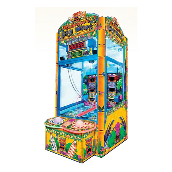 KAHUNA’S BIG WAVE – The object is to correctly time the release of your ball to roll down the “Big Wave” and into one of several vertical moving targets. If you get your ball through the smaller targets – you could win one of two separate and independent bonus features – The Little Tiki Bonus or the Big Wave Bonus. If your ball rolls through a larger target, you will be awarded a fixed amount of tickets. If the ball bounces off the rear targets, there is still an opportunity for it to drop into one of several playfield targets with fixed ticket amounts or drop into the “Lava Bonus” hole. This two-player game features two 42″ monitors and Hawaiian style drums and island music.