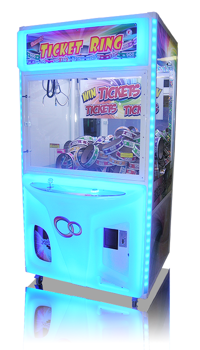 Add illuminated brilliance to your location with our new Ticket Ring CRANE. This exciting new crane features fully lit front panels with colors cast by LEDs. Choose the colors that best fit your location and add elegance and attraction to your crane. Players attempt to win Smart Ticket Ring prizes (Patent Pending) in various values. The Ticket Ring prizes can be redeemed at the redemption counter where tickets or swipe cards are used. In swipe card locations the attendant will credit the player’s card with the value of tickets won. In all locations the prizes are then recycled back into the game.